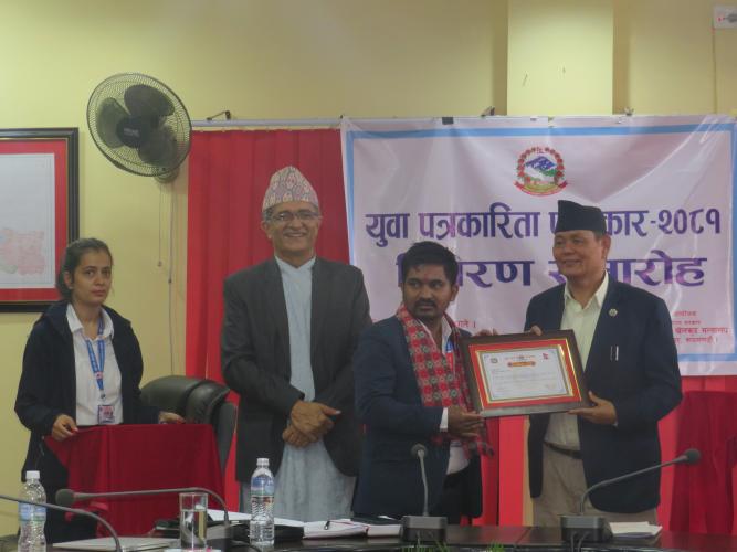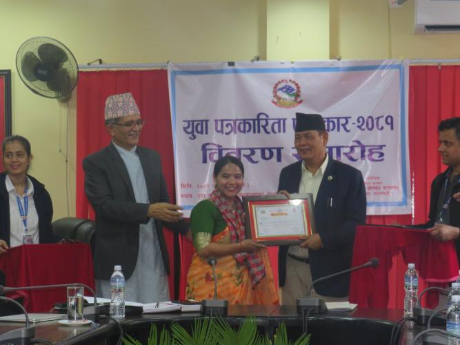 मिति २०८२ असार २७ गते माननीय युवा तथा खेलकुद मन्त्री श्री तेजु लाल चौधरीज्यूको प्रमुख आतिथ्यता, मन्त्रालयका सचिव डा. हरि प्रसाद लम्सालज्यू, मन्त्रालयका पदाधिकारीहरु, युवा तथा साना व्यवसायी स्वरोजगार कोषका पदाधिकारीहरु, सम्मानित पत्रकारहरुको समुपस्थितिमा युवा तथा खेलकुद मन्त्रालयको सभाहलमा युवा पत्रकारिता पुरस्कार वितरण कार्यक्रम सम्पन्न भयो । यस कार्यक्रममा सम्मानित एवम् पुरस्कृत हुनुहुने महानुभावहरुको विवरण यसप्रकार रहेको छः युवा पत्रकारिता सम्मान : (जनही नगद रु. ५० हजार।- सहित सम्मानपत्र) १. श्री प्रकृति दाहाल, मादी राम्बेनी नगरपालिका-५ संखुवासभा २. श्री ममता थापा, थाहा नगरपालिका-२ मकवानपुर ३. श्री गगनशिला खड्का, मालिका गाउँपालिका-५ गुल्मी ४. श्री सुशील दर्नाल, रैनादेवीछहरा गाउँपालिका-५ पाल्पा