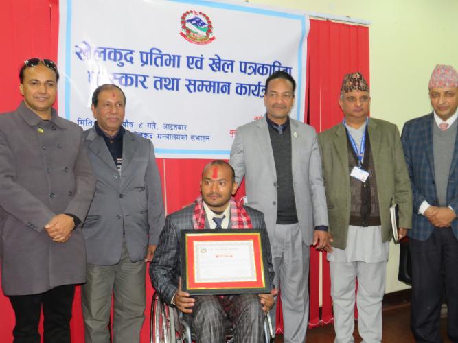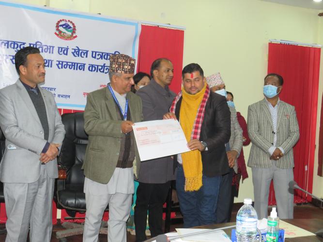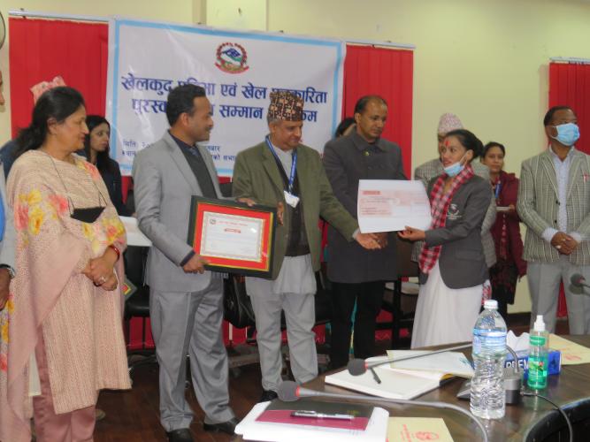 मिति २०७८ पौष ०४ गते माननीय युवा तथा खेलकुद मन्त्री श्री महेश्वर जंग गहतराज (अथक) ज्यूको प्रमुख आतिथ्यतामा मन्त्रालयका सचिव डा. दामोदर रेग्मीज्यूको अध्यक्षता, राष्ट्रिय खेलकुद परिषद्का उपाध्यक्ष श्री शिव प्रसाद कोइरालाज्यू, मन्त्रालयका सहसचिव डा.कमल प्रसाद पोख्रेलज्यू, श्री विष्णुराज ढकालज्यू, छनोट समितिका पदाधिकारीज्यूहरु र मन्त्रालयका कर्मचारीहरु सहितको सहभागितामा राष्ट्रिय खेलकुद प्रतिभा एवं खेल पत्रकारिता पुरस्कार तथा सम्मान कार्यक्रम सम्पन्न भयो । सम्मानीत हुनु भएका खेल प्रतिभा एंव पत्रकारहरुको नामावली विवरण । खेलाडी साधारण तर्फ तपशिल बमोजिमका खेलाडीहरुलाई नगद रु. १ लाखका दरले प्रमाणपत्र सहित सम्मान गरिएको। एलन श्रेष्ठ, बेसिगाउँ जोरपाटी-८, काठमाडौं (कराँते) पुष्पा भण्डारी, सारदा -१४, सल्यान (एथलेटिक्स) दिपक हमाल, छिन्चु-७, सुर्खेत (उसु) जुनी राई, देउमाई -३ इलाम/ हाल धादिङ (उसु) सुस्मिता तामाङ, चाँगुनाराण - ४ भक्तपुर (उसु) खेलाडी पारा तर्फ नगद रु. १ लाख का दरले प्रमाणपत्र सहित सम्मान गरिएको केशव थापा, धौलागिरी -७ म्याग्दी, ( टेवल टेनिस) प्रशिक्षक तर्फ तपशिल अनुसारका दुई जना प्रशिक्षकहरुको समान अंक प्राप्त भएकाले जनही रु. ५०,00० (पचास हजार) का दरले प्रमाणपत्र सहित सम्मान गरिएको । संगीना वैद्य, विदुर-९, नुवाकोट (तेक्वान्दो) नोर्बु लामा, नागार्जुन-९, स्यूचाटार (तेक्वान्दो) निर्णायक/ रेफ्री तर्फ रु. १ लाख का दरले प्रमाणपत्र सहित सम्मान गरिएको । अशोक खड्का, कागेश्वरी मनोहरा, न.पा. २, काठमाडौं (तेक्वान्दो) खेलकुद पत्रकारिता पुरस्कार तथा सम्मान तर्फ रु ५० हजारका दरले प्रमाणपत्र सहित सम्मान गरिएको । हिमेश रत्न बज्राचार्य - काठमाडौं महानगरपालिका २४ मखनटोल (कान्तिपुर दैनिक) पत्रकारिता प्रोत्साहन पुरस्काररु २५ हजारका दरले प्रमाणपत्र सहित सम्मान गरिएको । सन्जु पौडेल - लुम्बिनि प्रदेश तिलोत्तमा नगरपालिका ६ रुपन्देही (कान्तिपुर दैनिक संवाददाता) विजय नेपाली - गण्डकी प्रदेश पोखरा महानगरपालिका १ भिमकालीपाटन नमिन ढकाल - प्रदेश नं १माई नगरपालिका ४ इलाम बसन्त खतिवडा -प्रदेश नं २बर्दिबास ३ महोत्तरी कुशल तिमल्सिना - बाग्मती प्रदेश रत्ननगर न.पा १२ चितवन सोनिता अर्याल-गण्डकी प्रदेश सहिद लखन न.पा १ गोरखा दिपक न्यौपाने - लुम्बिनी प्रदेश सैनामैना न.पा ७ रुपन्देही रमेश कुमार पाण्डे - कर्णाली प्रदेश विरेन्द्रनगर न.पा ९ सुर्खेत विनोद सिंह विष्ट - सुदुरपश्चिम प्रदेश दोगडाकेदार ३ बैतडी
