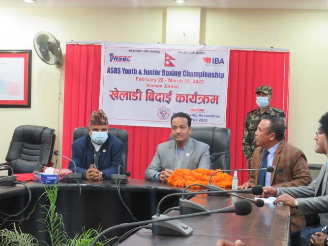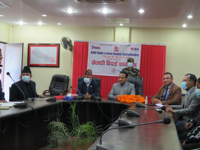 मिति २०७८ फागुन १५ गतेका दिन जोर्डनको अम्मानमा सञ्चालन हुने Asian youth and junior boxing championship मा भाग लिन नेपाल वक्सिङ संघबाट ३ जना खेलाडी र १ जना कोचलाई माननीय युवा तथा खेलकुद मन्त्री श्री महेश्वर जंग गहतराज (अथक), मन्त्रालयका सचिव डा. दामोदर रेग्मी र खेलकुद महाशाखा प्रमुख सहसचिव श्री लक्ष्मी प्रसाद भट्टराईको उपस्थितिमा विदाई कार्यक्रम सम्पन्न भयो ।