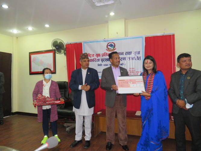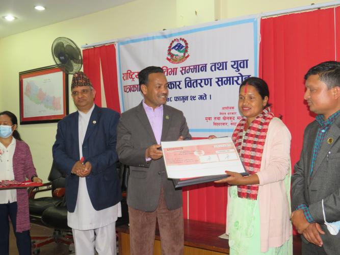 नेपाल सरकार युवा तथा खेलकुद मन्त्रालयले मिति २०७८ फागुन २९ गते मन्त्रालयका सचिव डा. दामोदर रेग्मीज्यूको अध्यक्षता, माननीय युवा तथा खेलकुद मन्त्री श्री महेश्वर जंग गहतराज (अथक) ज्यूको प्रमुख आतिथ्यता, राष्ट्रिय युवा परिषद्का उपाध्यक्ष, मन्त्रालयका युवा विकास महाशाखा प्रमुख, खेलकुद विकास महाशाखा प्रमुख, मुल्याङ्कन समितिका पदाधिकारीहरु, मन्त्रालयका कर्मचारीहरु तथा राष्ट्रिय युवा प्रतिभा सम्मान तथा युवा पत्रकारिताबाट सम्मानीत महानुभावहरुको उपस्थितिमा राष्ट्रिय युवा प्रतिभा सम्मान तथा युवा पत्रकारिता पुरस्कार वितरण कार्यक्रम सम्पन्न भयो । राष्ट्रिय युवा प्रतिभाहरुको नामावली १. हिमकुमारी उपाध्याय - विरेन्द्रनगर न.पा. १२, सुर्खेत २. धिर्जबहादुर उपरकोटी - बारपाक सुलिकोट गा.पा. ६, गोर्खा ३. मंगल बहादुर विष्ट - नरहरीनाथ गा.पा. १, कालीकोट ४. सन्तोष वोटे - भरतपुर म.न.पा.१३, चितवन ५. मिर्लुङ्ग बहुउद्देश्यीय कृषि फर्म प्रा.लि. - भानु न.पा. १२, तनहुँ ६. कुसुम के. सी. -सुन्दरबजार न.पा. ६, लमजुङ्ग ७. सुमित्रा घिमिरे - बकैया गा.पा. ४, मकवानपुर ८. राजन गौतम - देवचुली न.पा. १६, नवलपरासी (बर्दघाट सुस्ता पूर्व) ९. राज कुमारी पौडेल - विरेन्द्रनगर न.पा. १, सुर्खेत १०. राजाराम गुरुङ - शिवपुरी गा.पा. ४, नुवाकोट ११. अशोक शर्मा भट्ट - रत्ननगर न.पा. १५, चितवन १२. खिमप्रसाद पन्थी - मालारानी गा.पा. ८, अर्घाखाँची युवा पत्रकारहरुको नामावली १. बसन्ती बास्तोला शुक्ला गण्डकी न.पा.७, तनहुँ २. पूर्णबहादुर खड्का मंगलसेन न.पा. ७, अछाम ३. सिताराम ओझा आदर्श गा.पा. ४, डोटी ४. केशवबहादुर भुल कमलबजार न.पा. ५, अछाम
