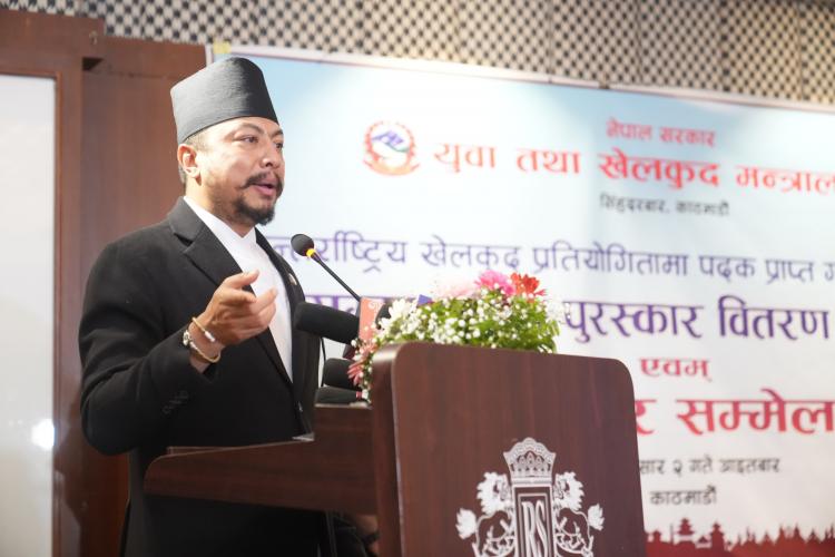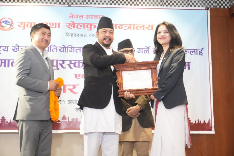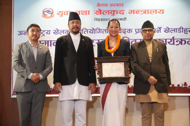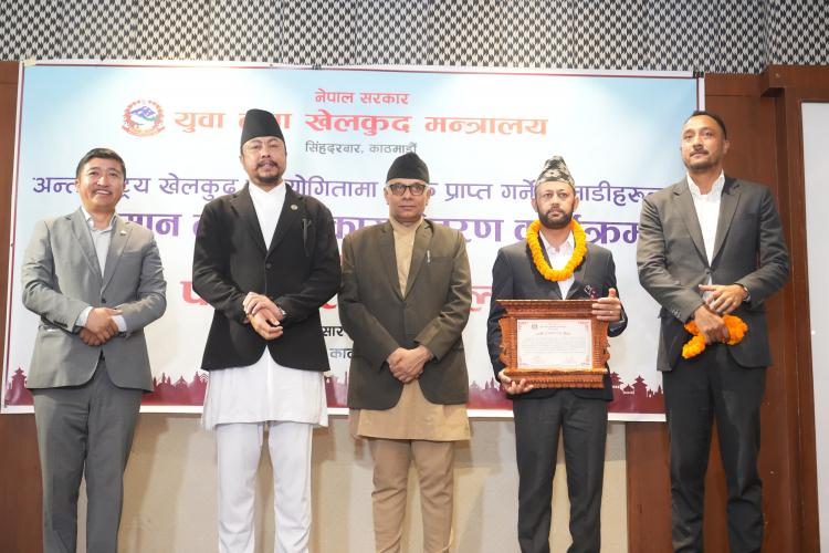 नेपाल सरकार, युवा तथा खेलकुद मन्त्रालयले आज विभिन्न अन्तराष्ट्रिय प्रतियोगितामा पदक विजेता खेलाडी, प्रशिक्षक तथा अफिसियललाई नेपाल सरकार, मन्त्रिपरिषद्को मिति २०८१/१/२७ को निर्णयानुसार कुल २ करोड ९७ लाख १० हजार नगद पुरस्कार सहित सम्मान गरिएको छ। * आइसीसी टी–२० विश्वकप क्रिकेट एशिया क्वालीफायरमा दोस्रो हुदै विश्व कपमा छनोट हुन सफल नेपाली राष्ट्रिय क्रिकेट टिमका प्रत्येक खेलाडीलाई जनही १३ लाख प्रदान, कुल २ करोड ४ लाख ७५ हजार प्रदान गरेको छ । * १९ औं एसियाली खेलकुदमा ऐतिहासिक रजत पदक विजेता एरिका गुरूङलाई १९ लाख ५० हजार प्रदान, कराते टिमलाई कुल २५ लाख ३५ हजार प्रदान गरेको छ । * १९ औं एसियाली खेलकुदमा ऐतिहासिक कास्य पदक विजेता महिला राष्ट्रिय कबड्डी टिमका प्रत्येक खेलाडीलाई ३ लाख ९० हजार प्रदान, १९ सदस्यीय टिमलाई ५२ लाख प्रदान प्रदान गरेकोछ । *चौथो एसियाली पारा खेलकुदमा ऐतिहासिक कास्य पदक विजेता पलेशा गोवर्धनलाई १३ लाख प्रदान, पारा तेक्वान्दो टिमलाई कुल १६ लाख ९० हजार प्रदान गरेको छ ।