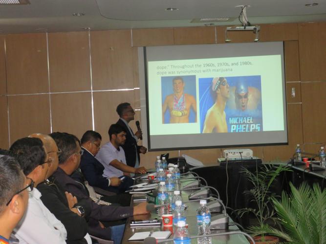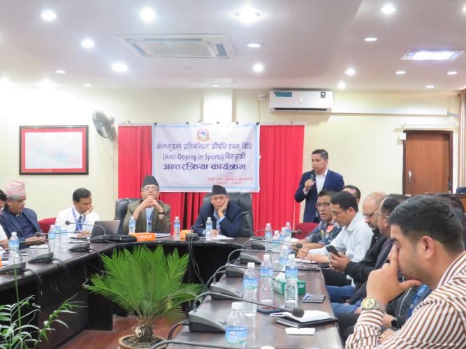 मिति २०८२ वैशाख ११ गते युवा तथा खेलकुद मन्त्रालयका मन्त्री माननीय तेजु लाल चौधरीज्यूको अध्यक्षता, मन्त्रालयका सचिव डा. हरि प्रसाद लम्साल, सहसचिव सुवास चन्द्र शिवाकोटी, मन्त्रालयका कर्मचारी, तीन वटै सुरक्षा निकायका विभागीय टिमका खेलकुद हेर्ने प्रमुख तथा प्रतिनिधि, चिकित्सक, राष्ट्रिय खेल संघ/महासंघका पदाधिकारी, राष्ट्रिय एन्टिडोपिङ एजेन्सीका पदाधिकारी तथा पत्रकारहरु लगायतको समुस्पस्थितिमा “खेलकुदमा प्रतिबन्धित औषधी सेवन एवम् विधि विरुद्धको अन्तरक्रिया कार्यक्रम” मन्त्रालयको सभाहलमा सम्पन्न भयो।उक्त कार्यक्रममा South Asia Regional Anti-Doping Organization (SARADO) माल्दिभ्सका Manager Mr. Husain Mohamed ले World Anti-Doping Agency (WADA), Regional Anti-doping Agency र National Anti-doping agency (NADA) सम्बन्धी विषयवस्तुका बारेमा भर्चुअल विधि मार्फत् प्रस्तुतिकरण दिनु भएको थियो भने दक्षिण एशियाली क्षेत्रीय एन्टिडोपिङ संस्था SARADO का बोर्ड सदस्य एवम् चिकित्सा विज्ञान राष्ट्रिय प्रतिष्ठानका रजिष्टार डा. ज्ञानेन्द्र विक्रम शाह र राष्ट्रिय एन्टिडोपिङ एजेन्सीका संयोजक डा. असिम भण्डारीले खेलकुदमा प्रतिबन्धित औषधि सेवन एवम् विधि विरुद्धको राष्ट्रिय तथा अन्तर्राष्ट्रिय नीति तथा कानून, डोपिङ विधि तथा प्रक्रिया, खेलाडीले प्रयोग गर्न नहुने औषधि लगायतका विषयमा सहजिकरण गर्नु भएको थियो।