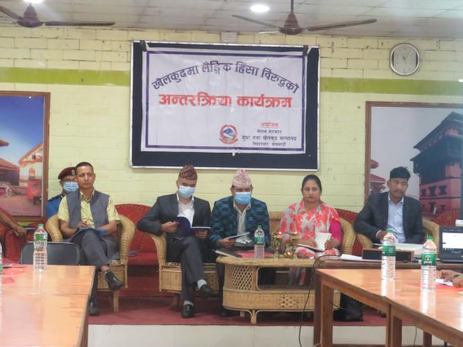 मिति २०७९ श्रावण २० गतेका दिन नुवाकोट जिल्लाको विदुर नगरपालिकामा "खेलकुदमा लैङ्गिक हिंसा विरुद्धको सचेतना कार्यक्रम सम्पन्न भयो । युवा तथ खेलकुद मन्त्रालयका सहसचिव श्री विदुर प्रसाद खनालज्यूको अध्यक्षता, विदुर नगरपालिका उपप्रमुख श्री प्रभा वोगटीज्यूको प्रमुख आतिथ्यता, नुवाकोट जिल्लाका प्रमुख जिल्ला अधिकारी श्री नारायण प्रसाद रिसालज्यूको आतिथ्यता, विदुर नगरपालिकाका प्रमुख प्रशासकिय अधिकृत श्री विनोद कुमार खनालज्यू, प्रहरी नायव उपरिक्षक श्री रुपक खड्काज्यू, नुवाकोट जिल्ला खेलकुद विकास समितिका अध्यक्ष श्री सन्तोष राईज्यू, जिल्ला खेलकुद विकास समितिका कार्यालय प्रमुख श्री सन्तोषी वैद्यज्यू, मन्त्रालयका कर्मचारीहरु, खेलाडी, शिक्षक तथा खेलपत्रकार सहितको सहभागीतामा कार्यक्रम सम्पन्न भएको थियो । उक्त अन्तरक्रिया कार्यक्रममा राष्ट्रिय खेलकुद परिषद्का खेलकुद विज्ञ श्री सुलोचना सिजख्वाले सहजिकरण गर्नु भएको थियो ।