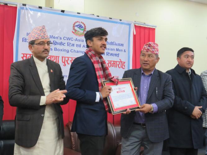मिति २०८० माघ २८ गते युवा तथा खेलकुद मन्त्रालयका माननीय मन्त्री श्री डिगबहादुर लिम्बुज्यूको प्रमुख आतिथ्यता, मन्त्रालयका सचिव श्री रविलाल पन्थको अध्यक्षता, राष्ट्रिय खेलकुद परिषद्का सदस्य सचिव श्री टंकलाल घिसिङ, मन्त्रालयका सहसचिव श्री शिव प्रसाद रेग्मी, नेपाल बक्सिङ संघ तथा नेपाल क्रिकेट संघका पदाधिकारीहरु लगायतको आतिथ्यतामा युवा तथा खेलकुद मन्त्रालयको सभाहलमा ICC U-19 Men’s CWC-Asia Qualifier प्रतियोगितामा विजेता नेपाली राष्ट्रिय क्रिकेट टिम एवं ASBC U-22 Asian men & women’s Boxing Championship का खेलाडी, प्रशिक्षक तथा अफिसियलहरुलाई नगद पुरस्कार सहित सम्मान कार्यक्रम सम्पन्न भयो। ICC U-19 Men’s CWC-Asia Qualifier क्रिकेट प्रतियोगितामा पदक विजेताको नामावली १ देव खनाल कप्तान ३ लाख २ दिपेश प्रसाद कंडेल उपकप्तान ३ लाख ३ दीपक बोहरा खेलाडी ३ लाख ४ आकाश त्रिपाठी खेलाडी ३ लाख ५ उत्तम रंगु थापा मगर खेलाडी ३ लाख ६ दिपक प्रसाद डुम्रे खेलाडी ३ लाख ७ अर्जुन कुमाल खेलाडी ३ लाख ८ आकाश चन्द खेलाडी ३ लाख ९ हेमन्त धामी खेलाडी ३ लाख १० दिपक बोहरा खेलाडी ३ लाख ११ दुर्गेश गुप्ता खेलाडी ३ लाख १२ सुभाष भण्डारी खेलाडी ३ लाख १३ विशाल विक्रम के.सी. खेलाडी ३ लाख १४ मिलन बोहरा खेलाडी ३ लाख मुख्य प्रशिक्षक र अफिसियलहरु १ जगत बहादुर टमाटा मुख्य प्रशिक्षक २ लाख २ विक्रम विष्ट टिम व्यवस्थापक १ लाख ३ पूर्ण बहादुर तिरुवा फिजियो १ लाख ASBC U-22 Asian men & women’s Boxing Championship मा पदक विजेताको नामावली १ सुष्मा तामाङ खेलाडी महिला रजत ६ लाख २ हेमा राई खेलाडी महिला काश्य ३ लाख ३ त्रिशा जबेगु खेलाडी महिला काश्य ३ लाख ४ विजय बाटा खेलाडी पुरुष काश्य ३ लाख मुख्य प्रशिक्षक र सहायक प्रशिक्षक १ दिपक महर्जन मुख्य प्रशिक्षक १ लाख ८ हजार २ सन्दिप श्रेष्ठ सहायक प्रशिक्षक ७२ हजार